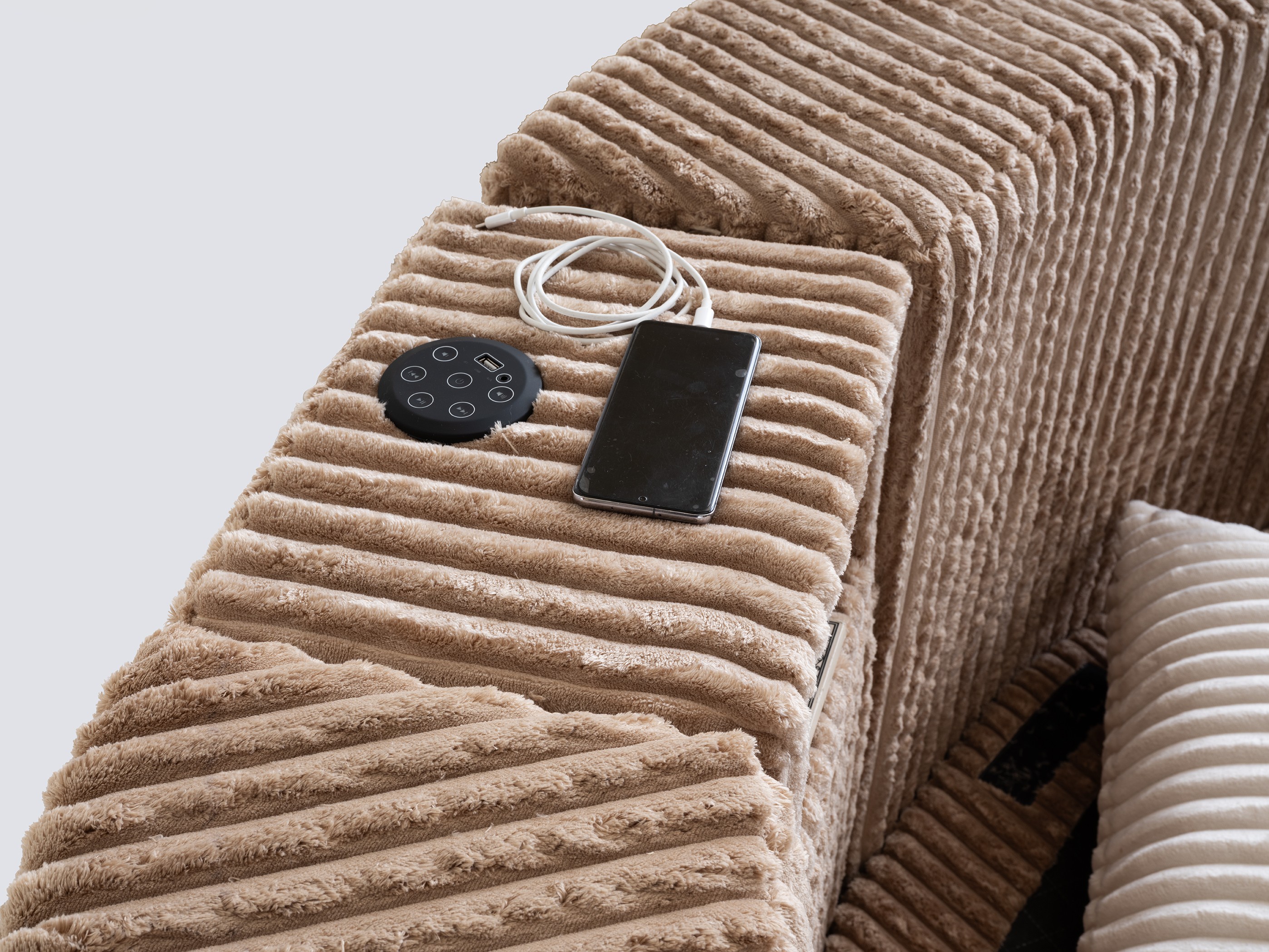 Smart Armrest: Combines technology and functionality with a built-in speaker/charging unit (based on the image detail) and hidden storage compartments.