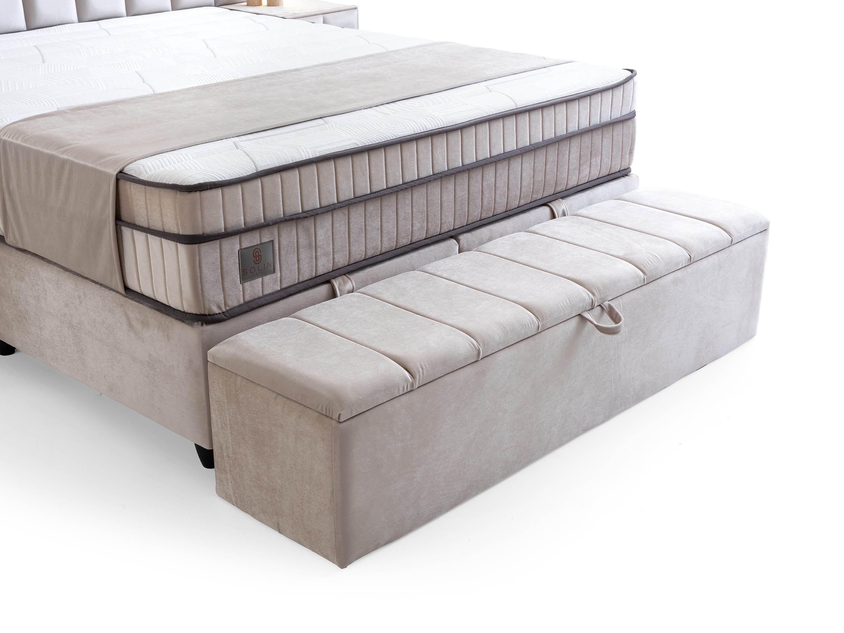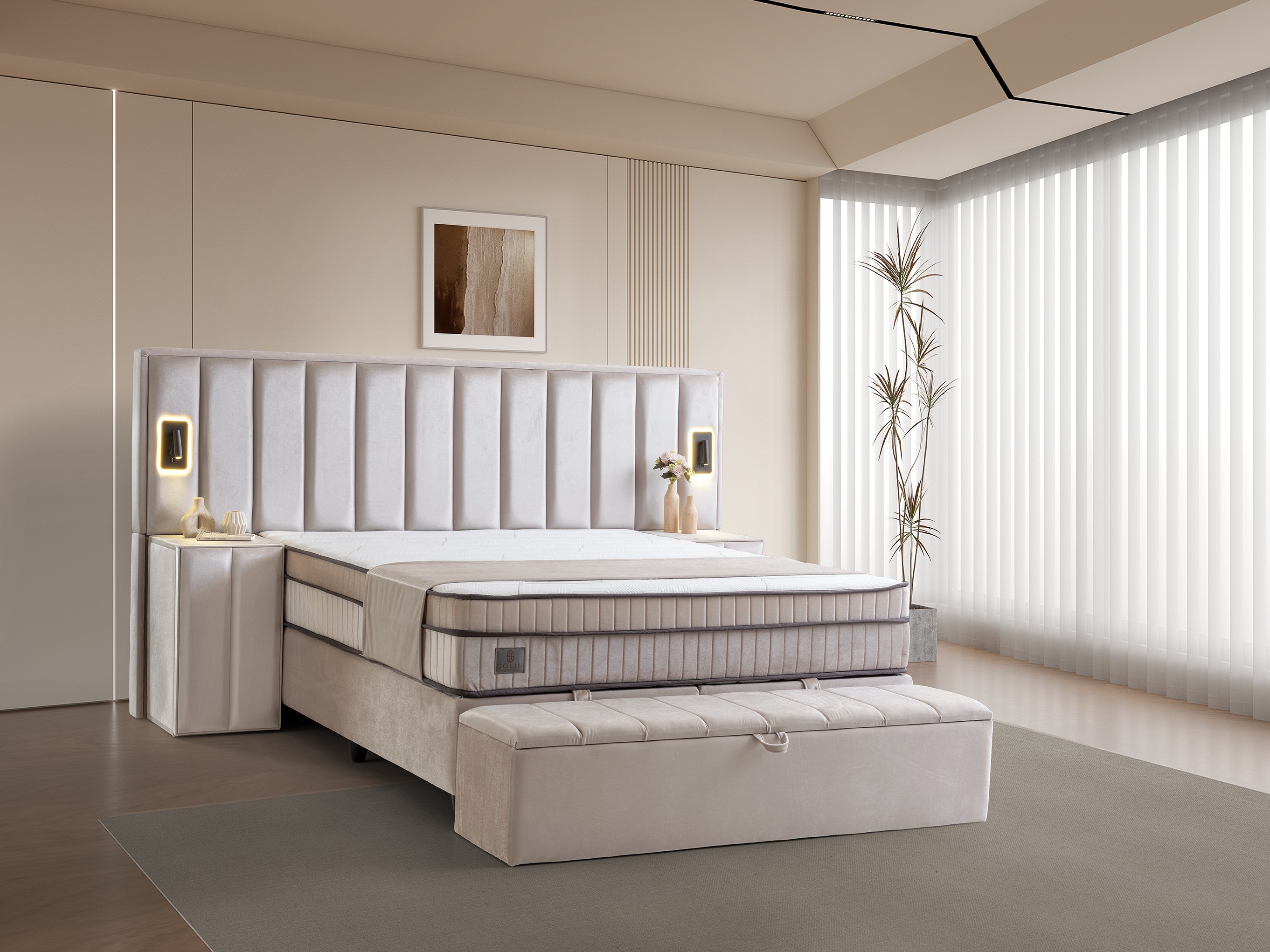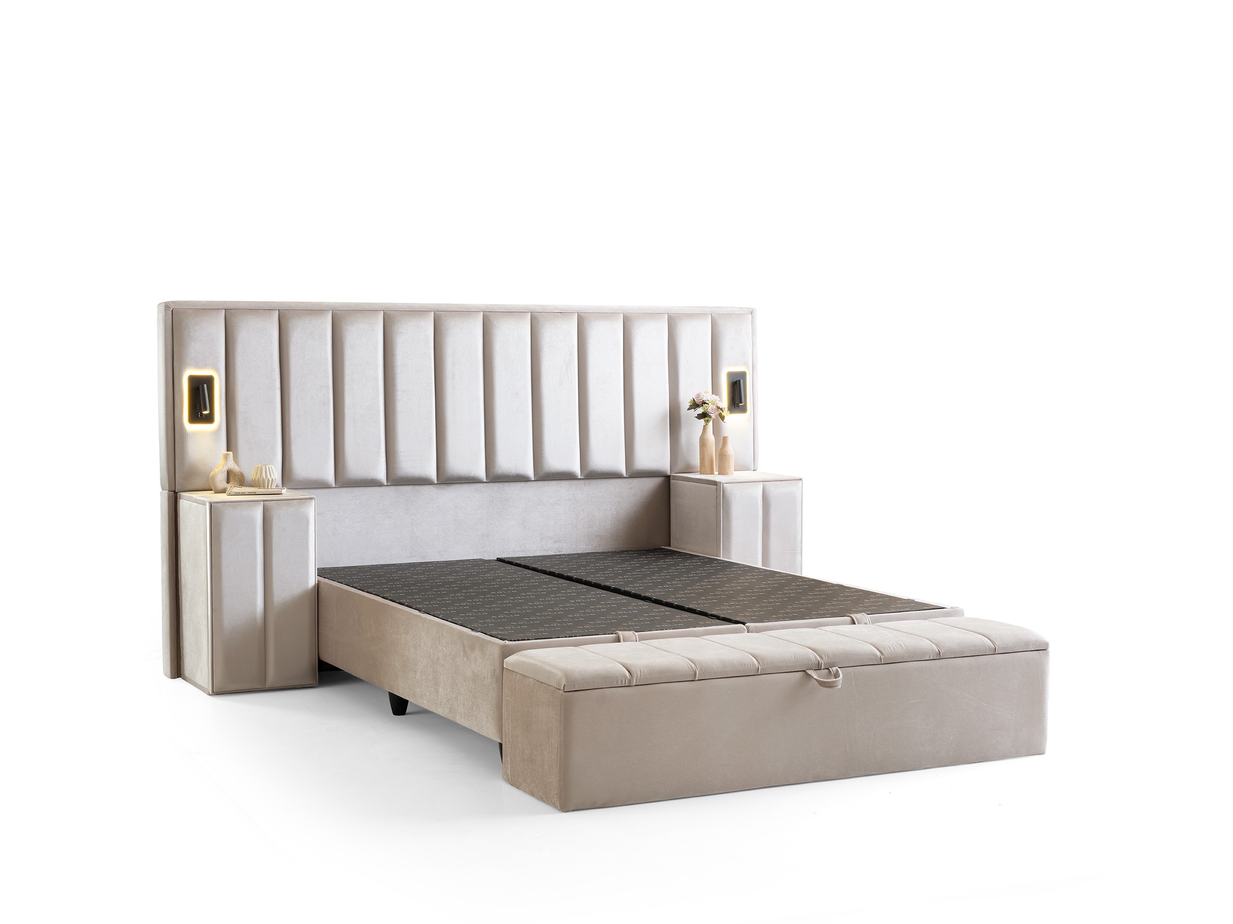 Design Cohesion: Matching nightstands with drawers that perfectly complement the headboard, and a spacious storage bench (pouf) at the foot of the bed, provide both extra storage and flawless aesthetics.