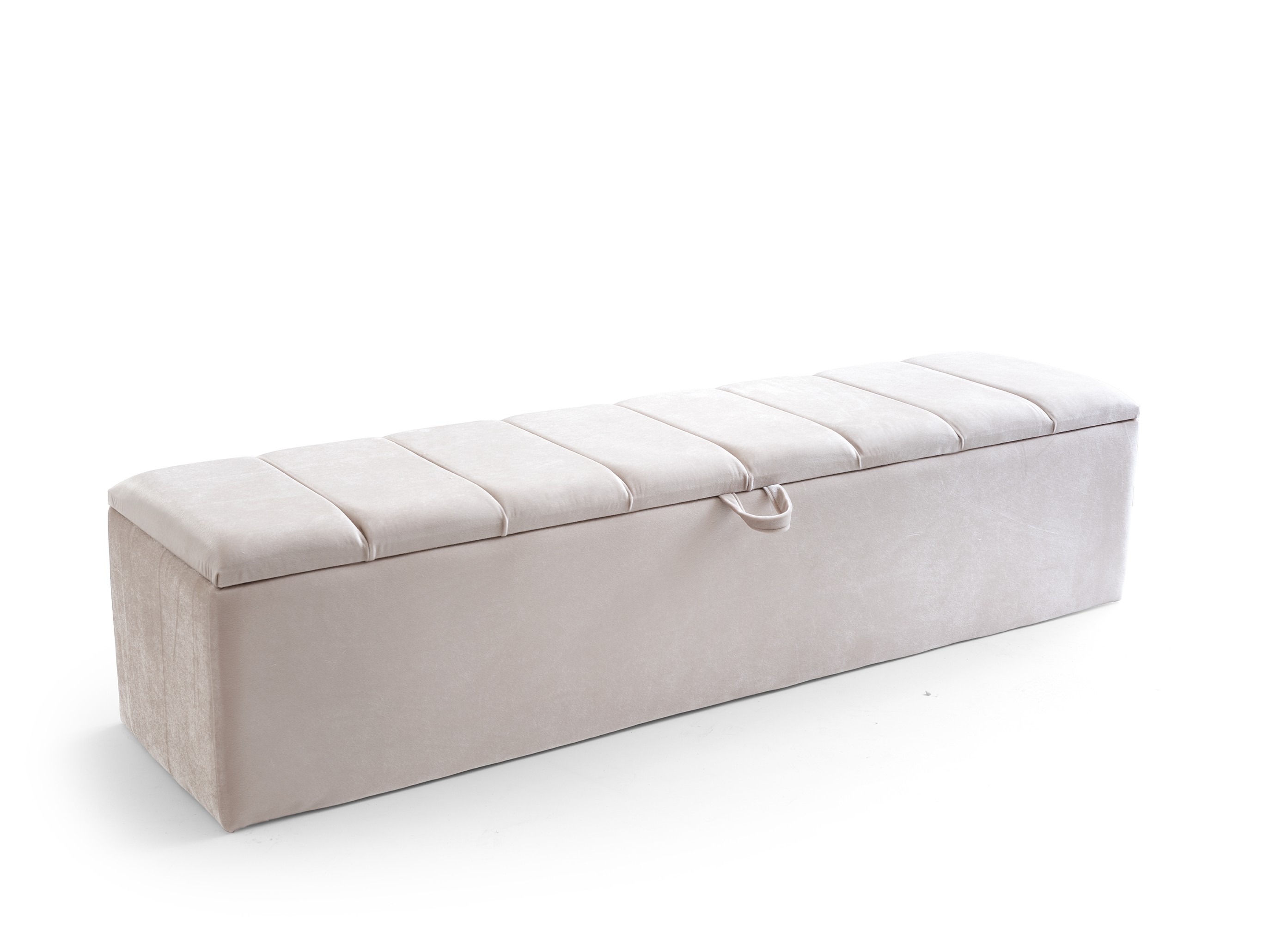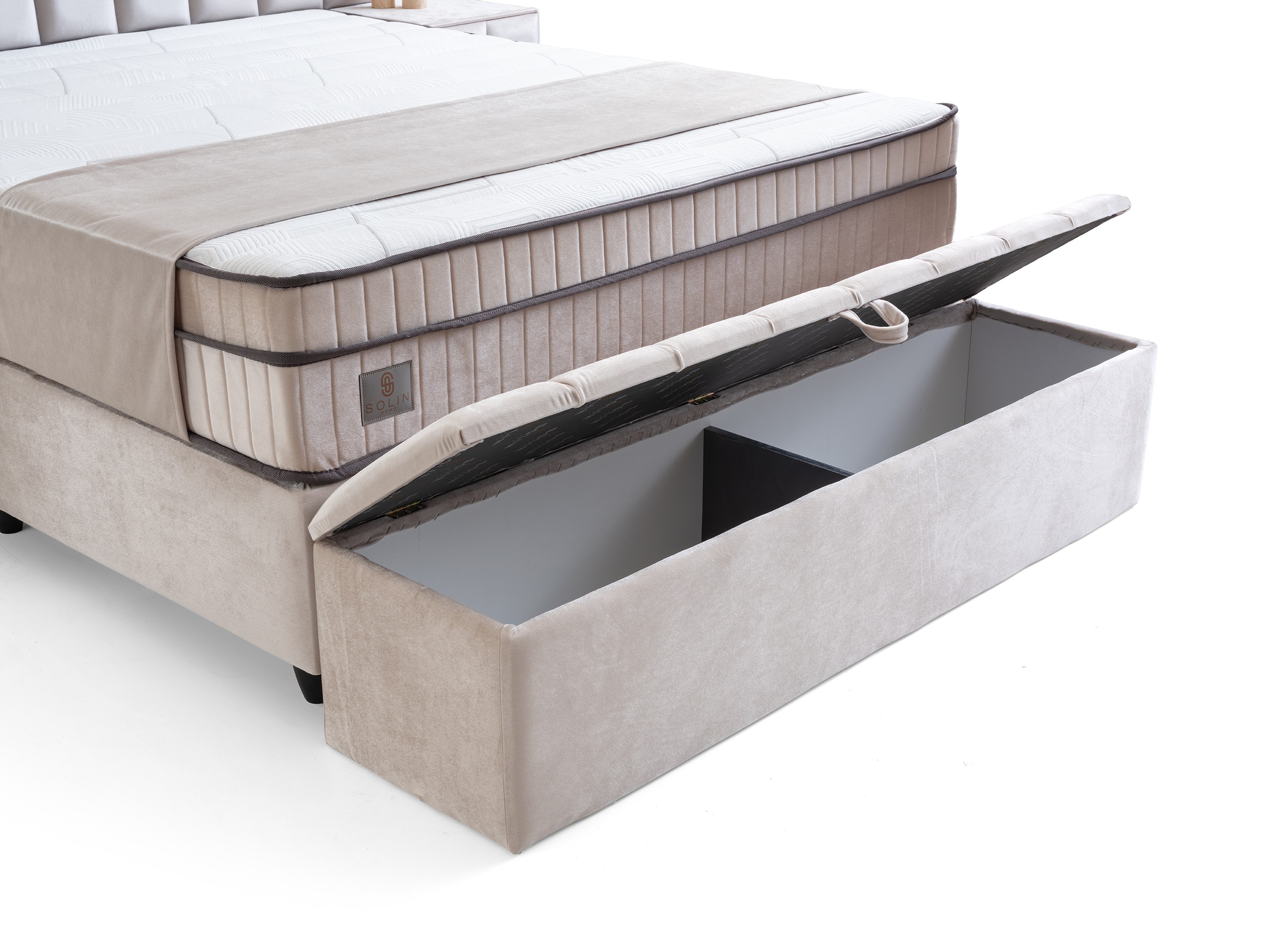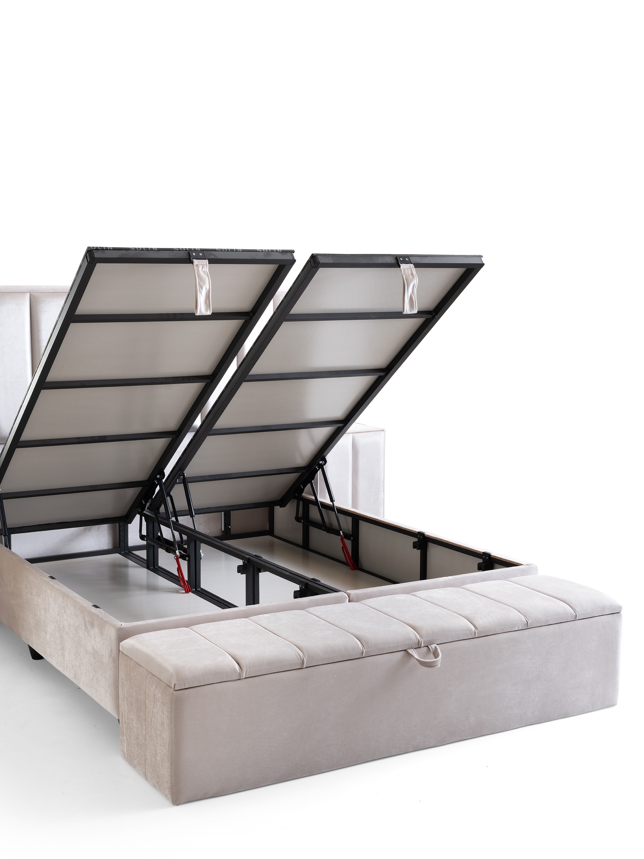 Design Cohesion: Matching nightstands with drawers that perfectly complement the headboard, and a spacious storage bench (pouf) at the foot of the bed, provide both extra storage and flawless aesthetics.