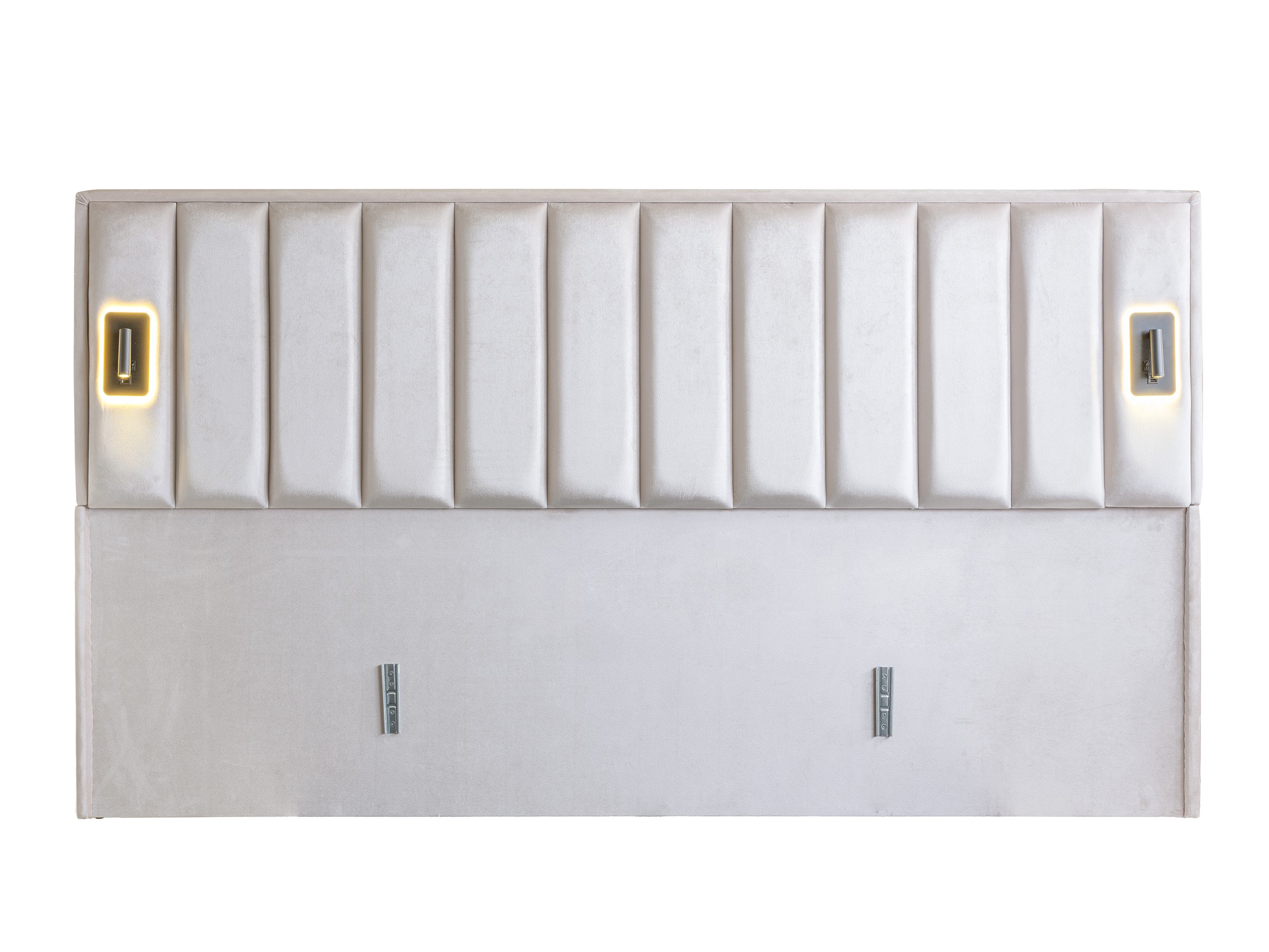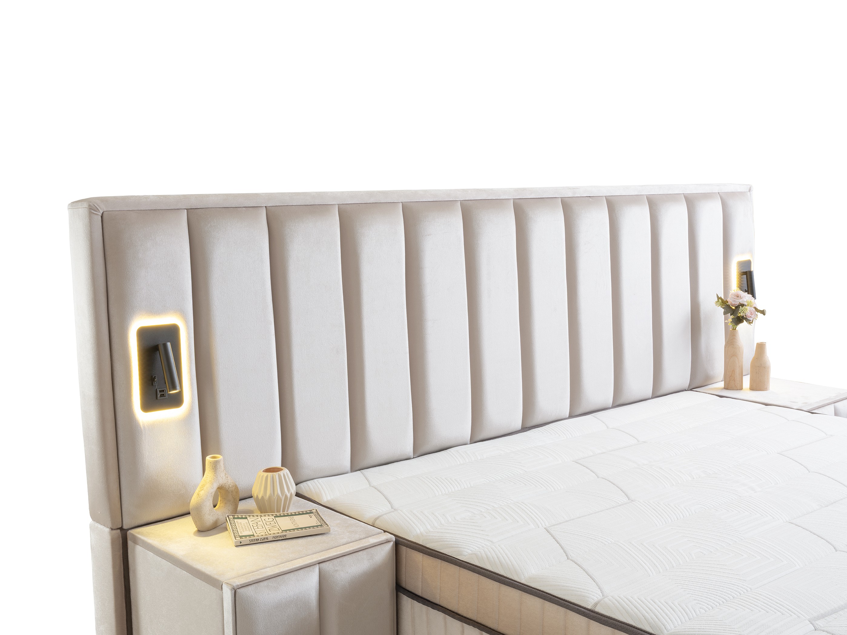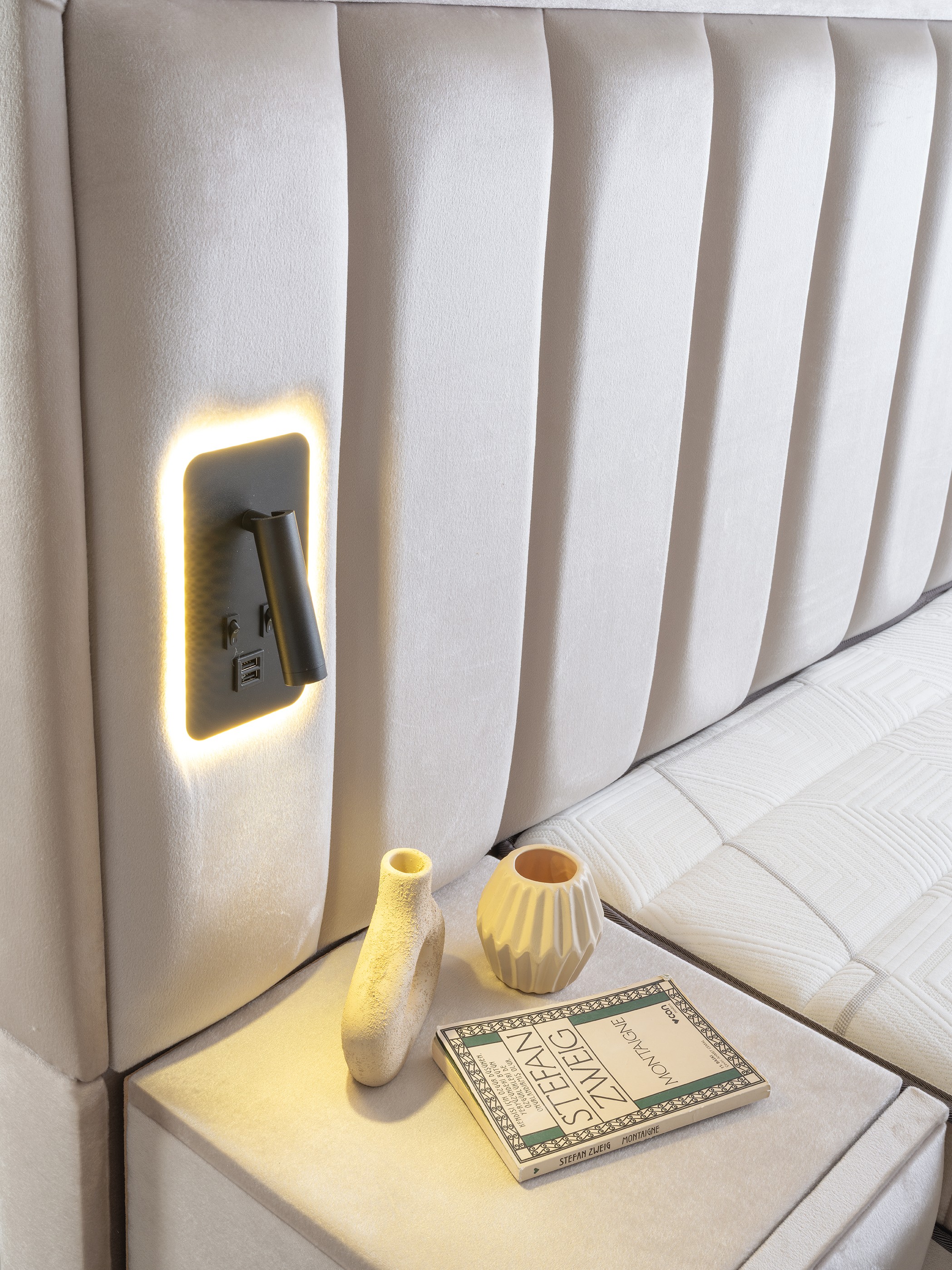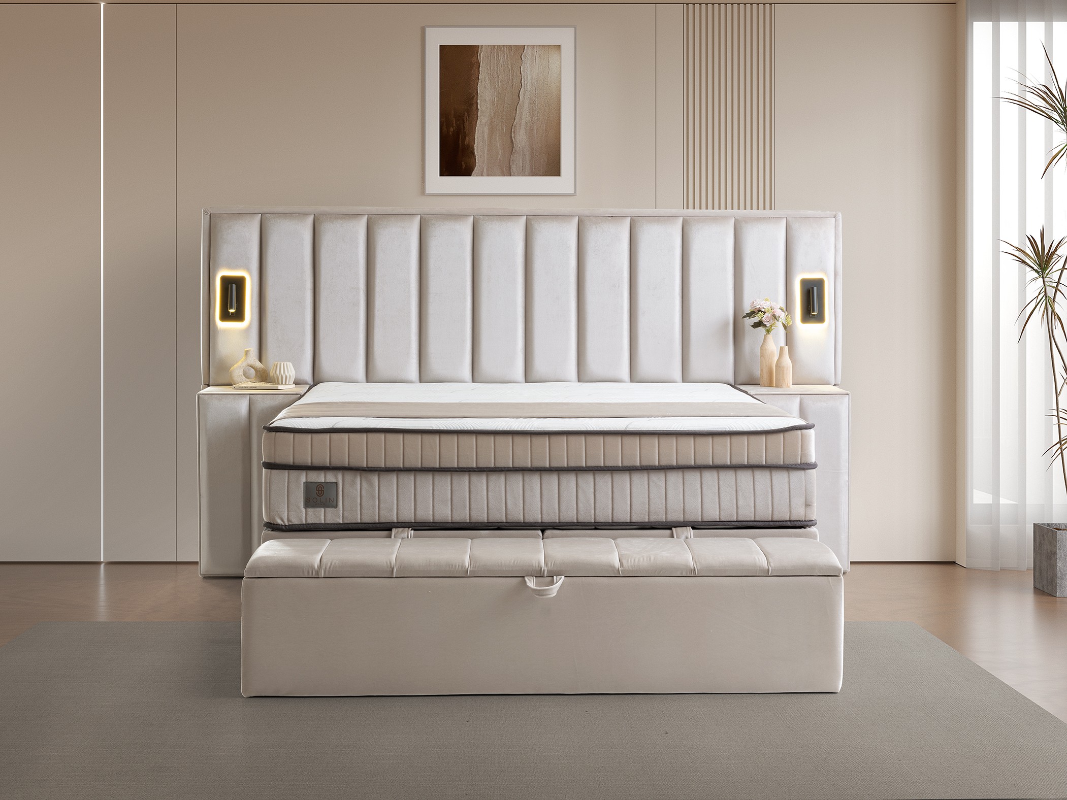 Vertical Headboard with Lighting: The tall, vertically paneled headboard features integrated modern lighting on its side wings, adding a warm ambiance to your room and creating a stunning focal point.