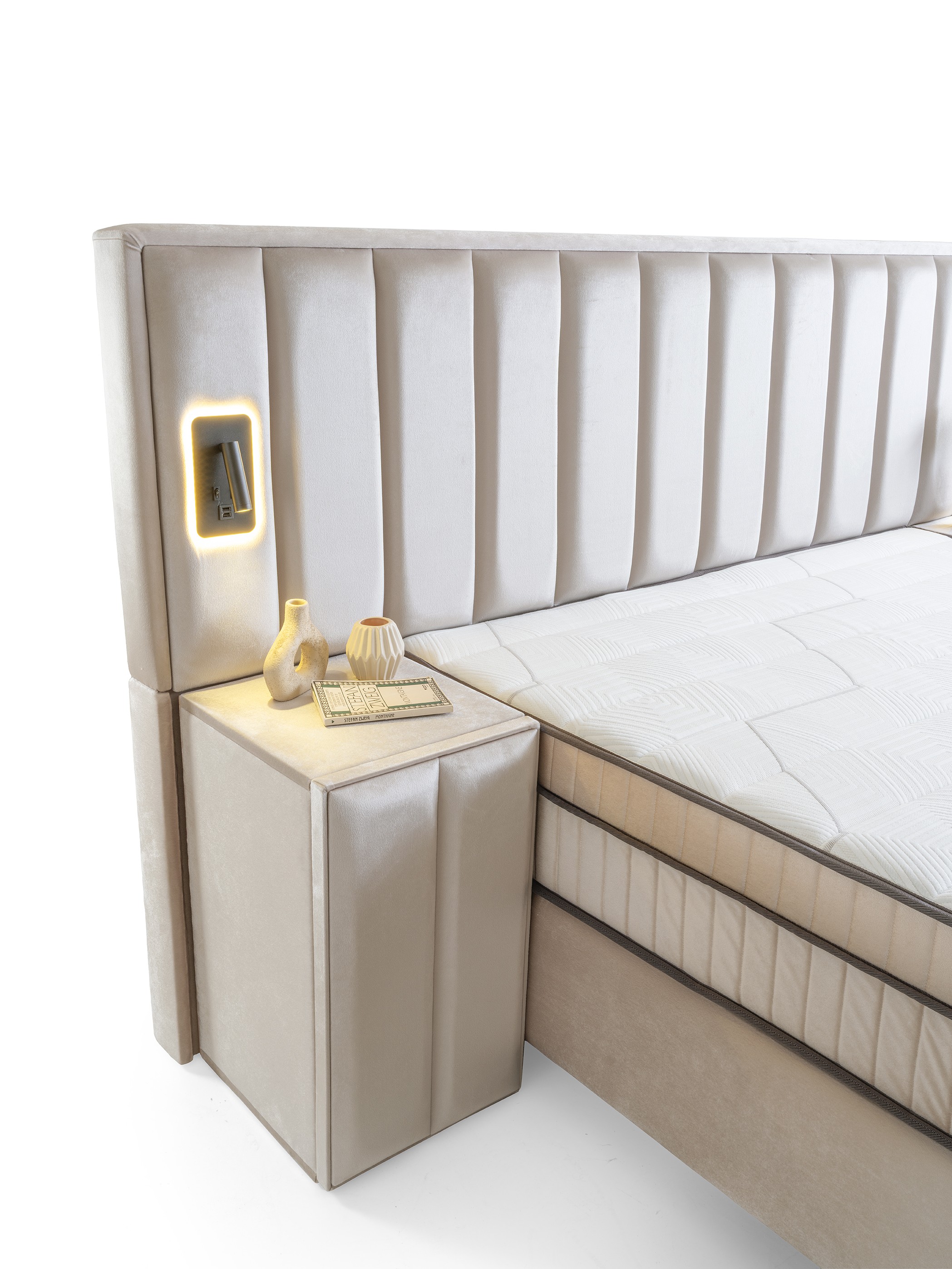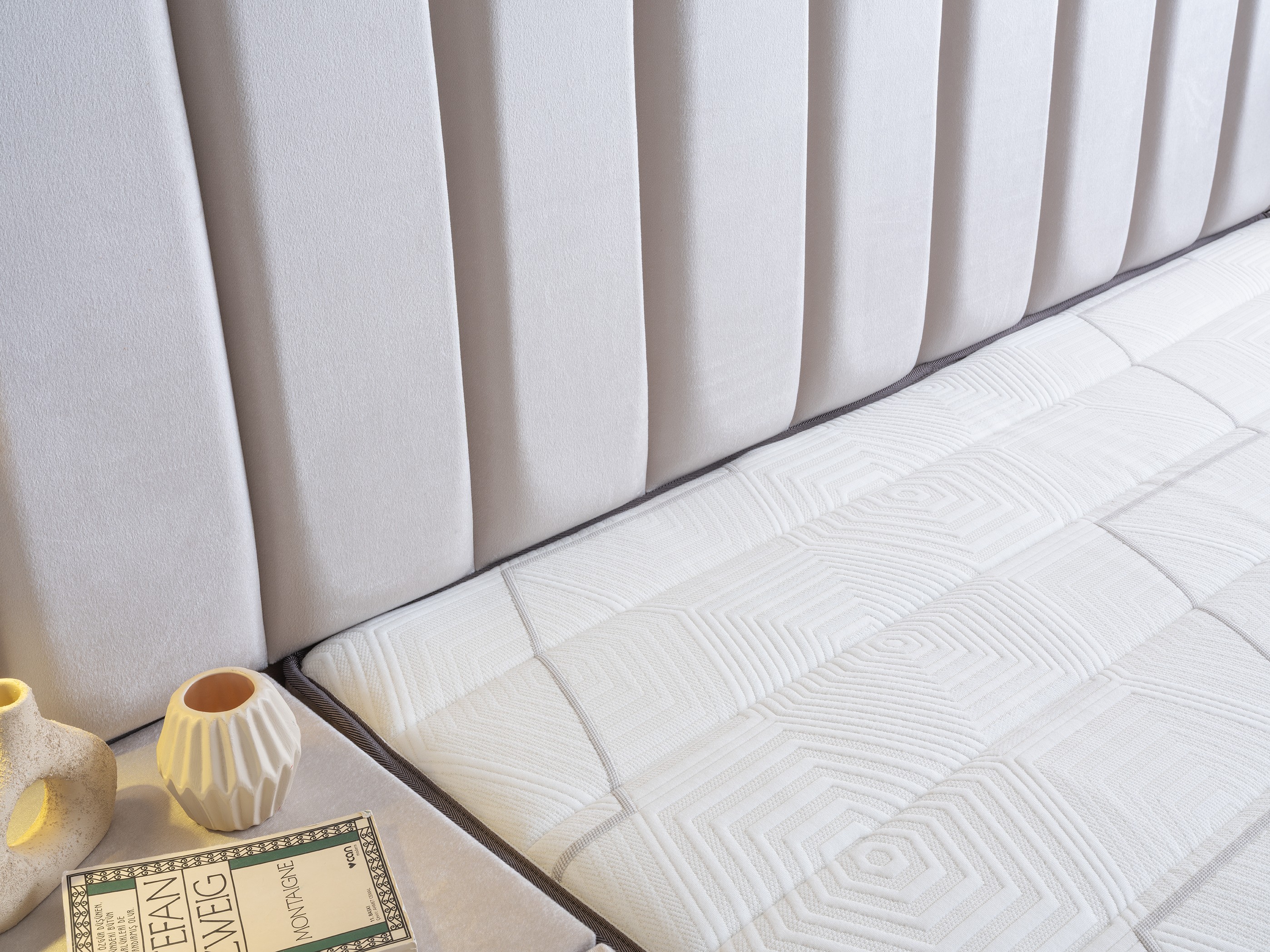 Bring hotel comfort and modern elegance together in your bedroom. The Torino Bed Base & Headboard Set adds a new dimension to design with its majestic vertically stitched headboard and luxurious fabric texture. This set, offering integrated elegance in every detail, will transform your room into a sophisticated living space.