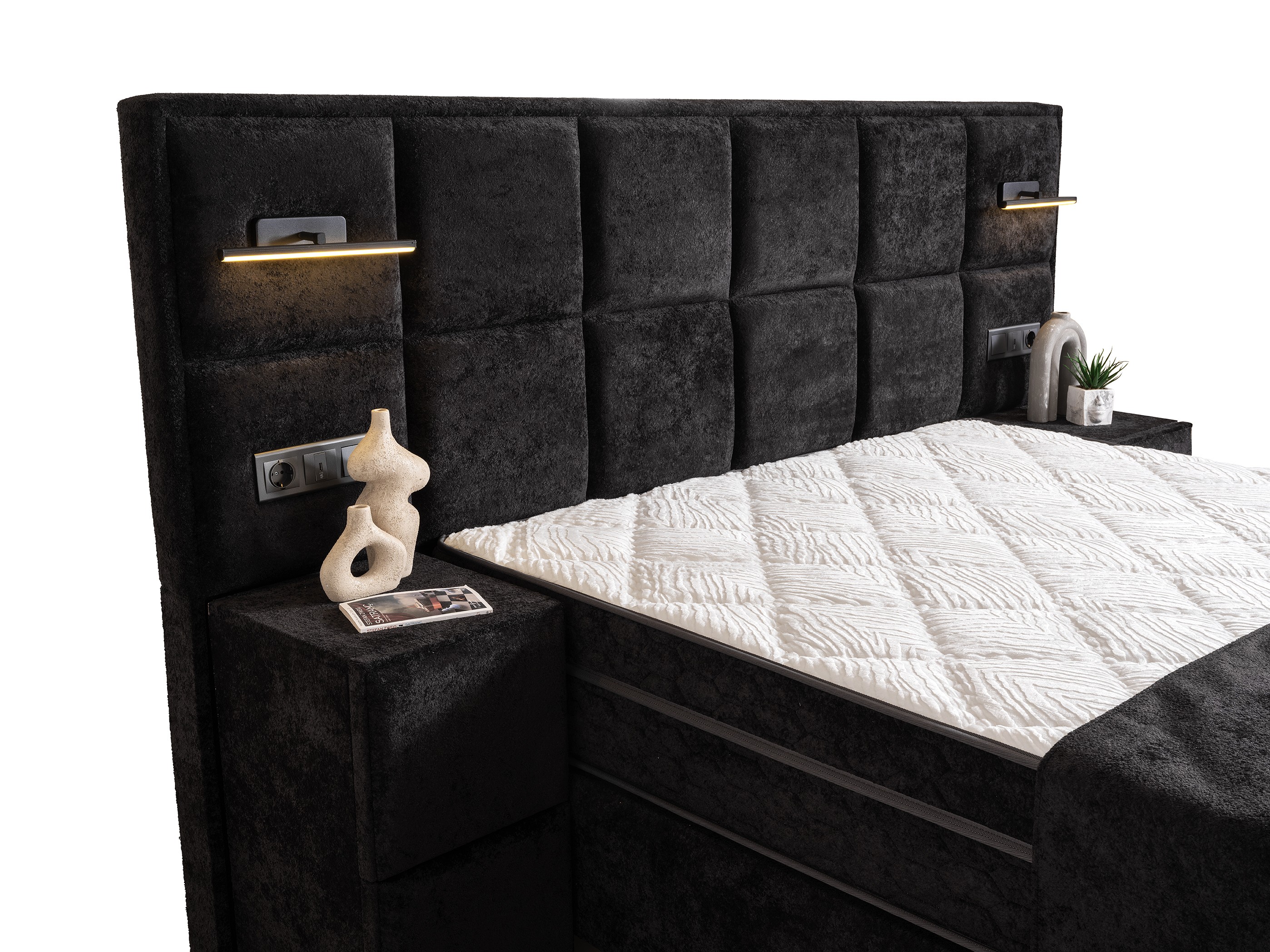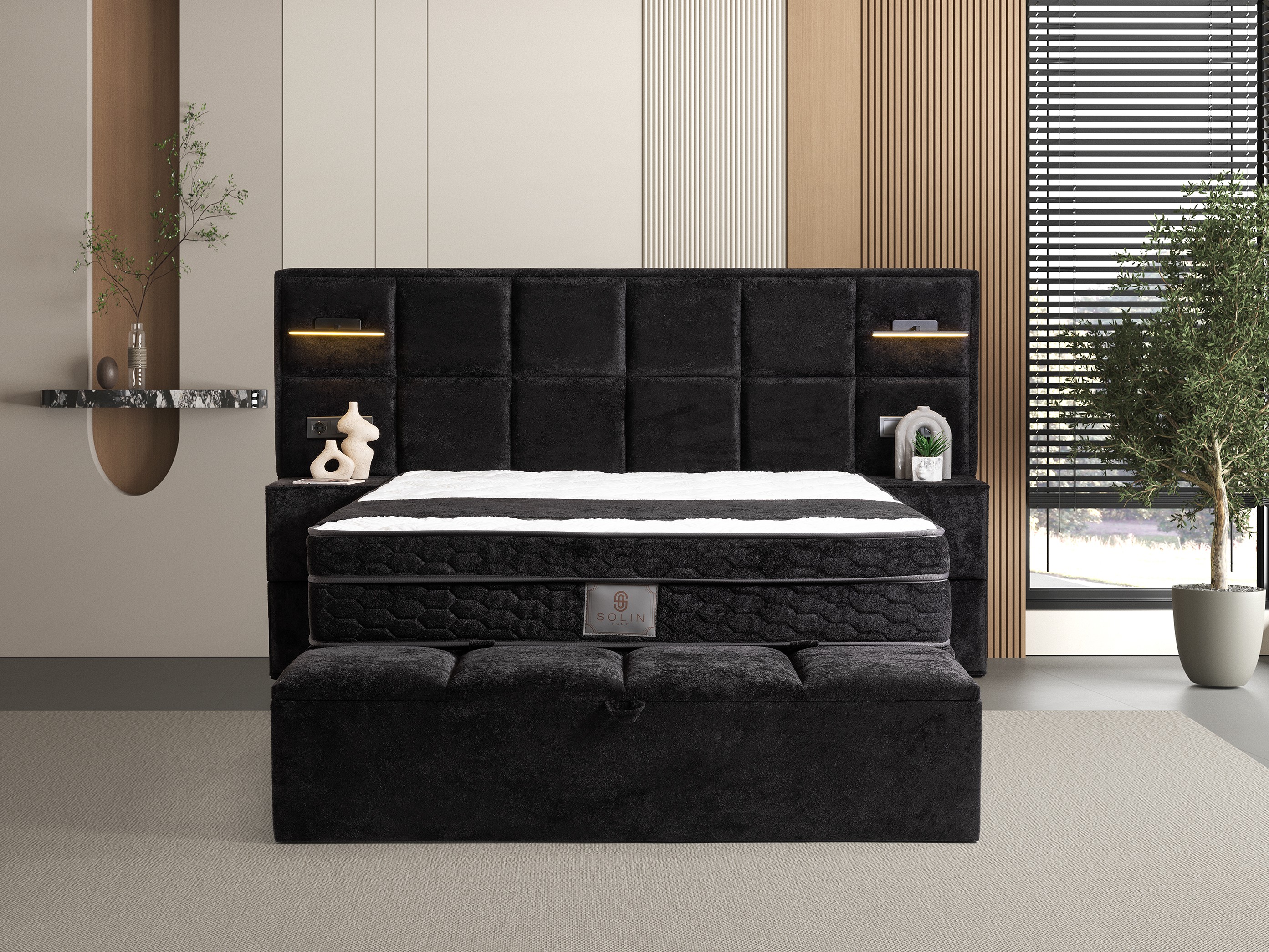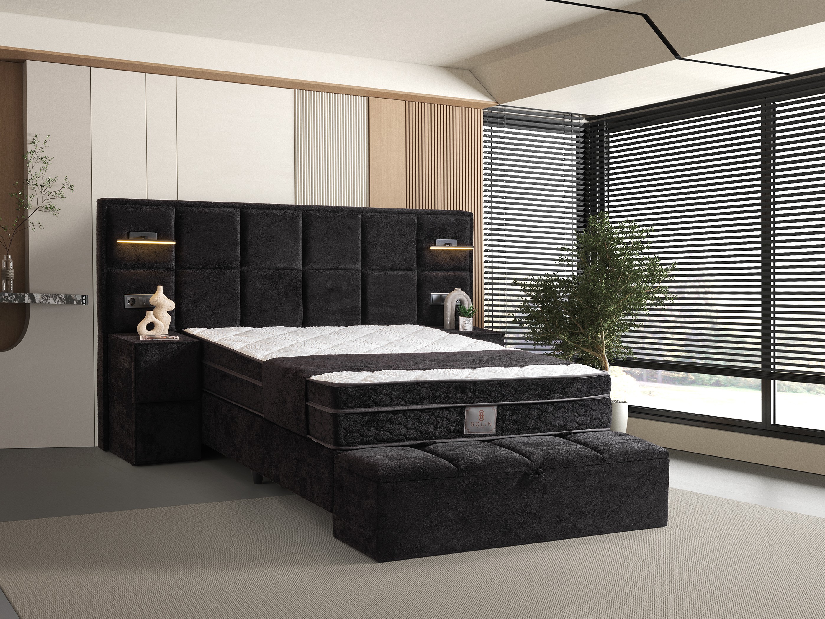 Tufted Headboard & Lighting: The tall, grid-tufted headboard with integrated modern lighting offers both a magnificent look and functional use for relaxing in bed.