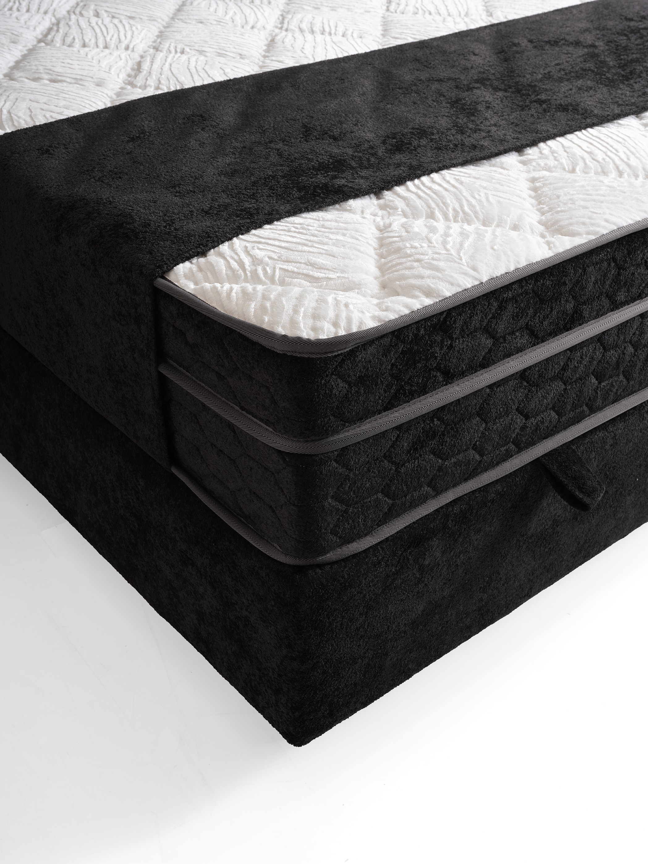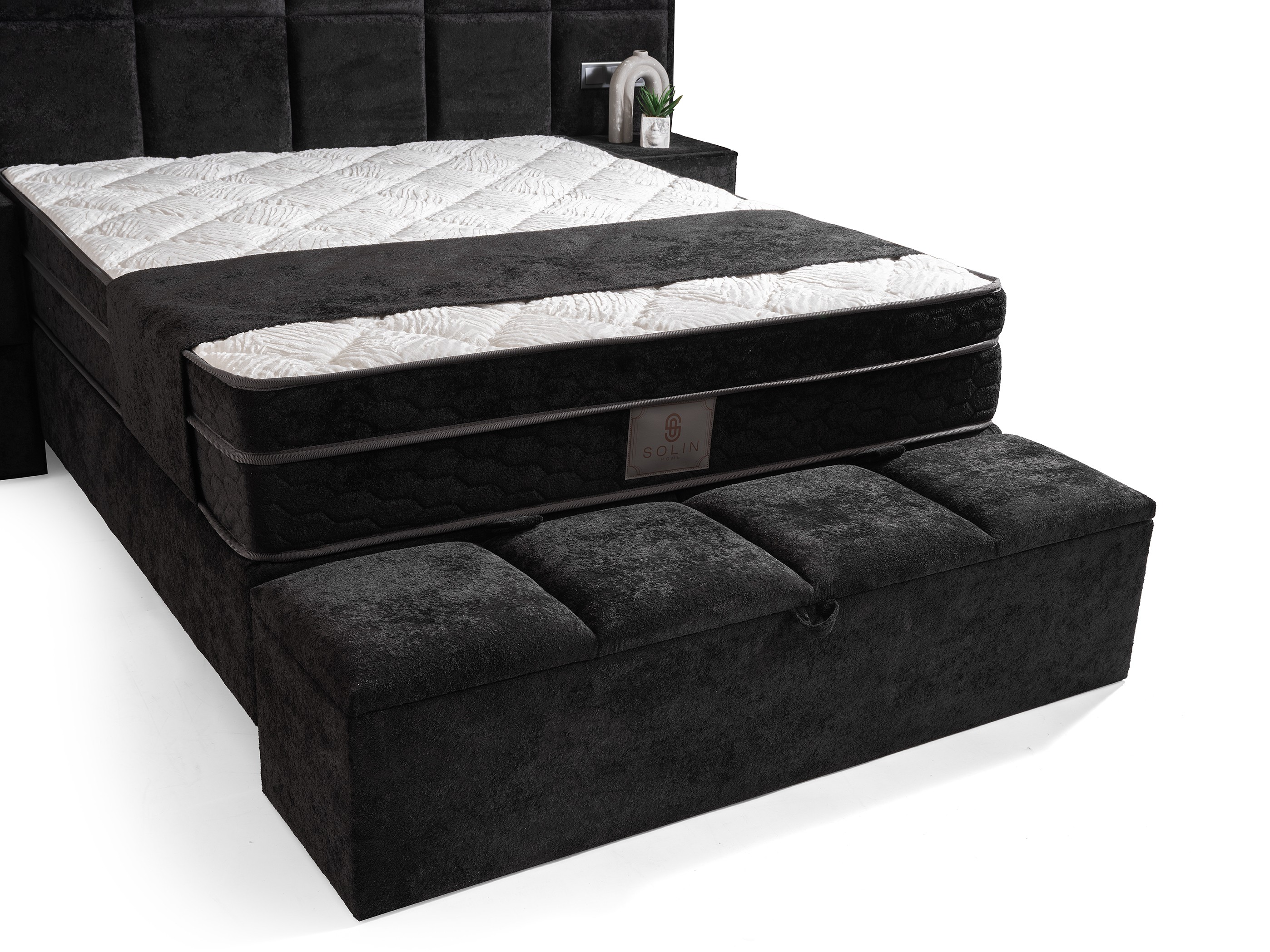 Designed to make a bold, luxurious statement in your bedroom. The Vanessa Black Bed Base & Headboard Set offers five-star hotel comfort with its rich velvety texture and modern design. Instantly transform your room's ambiance with this complete set that redefines elegance in every detail.