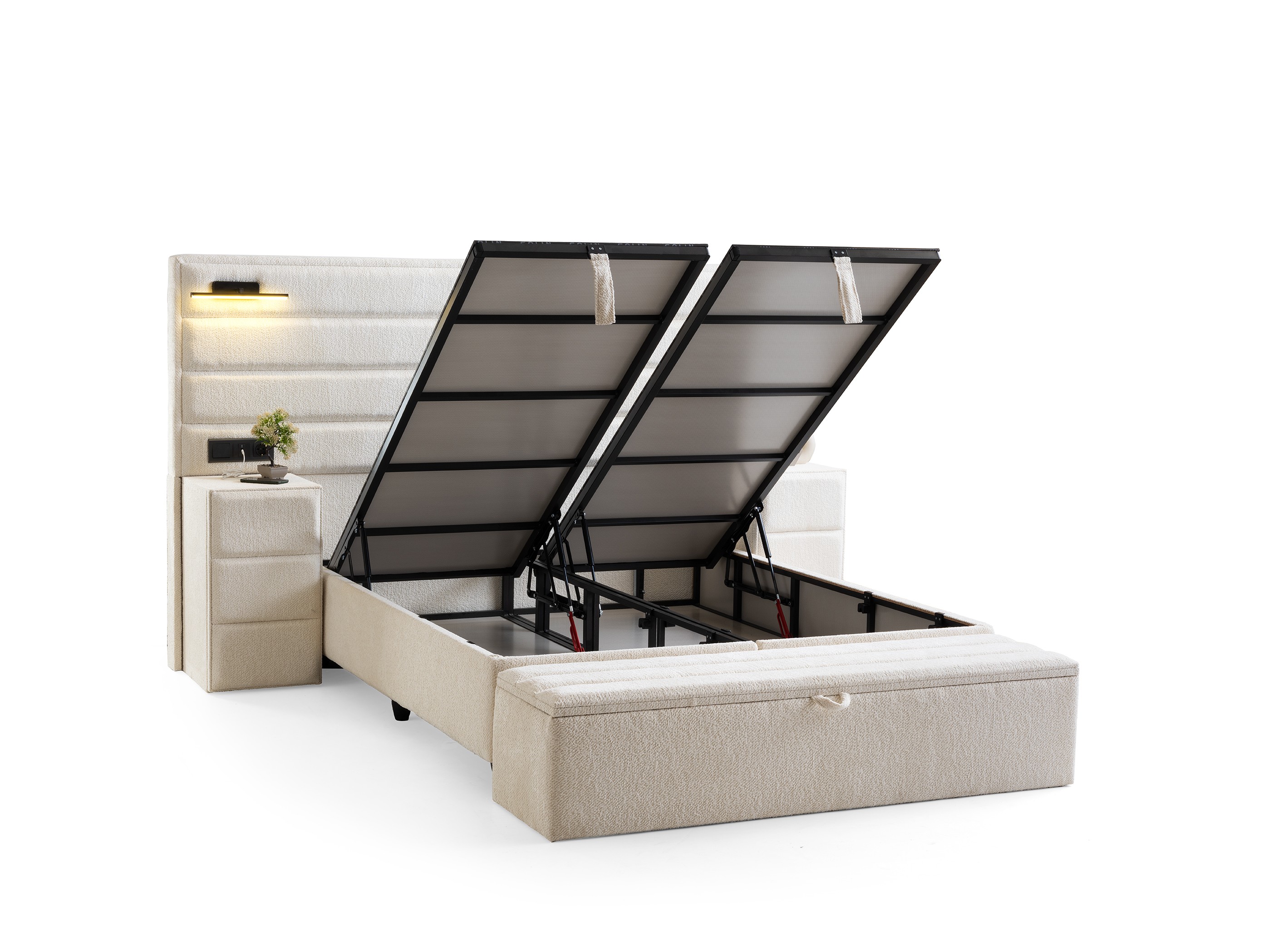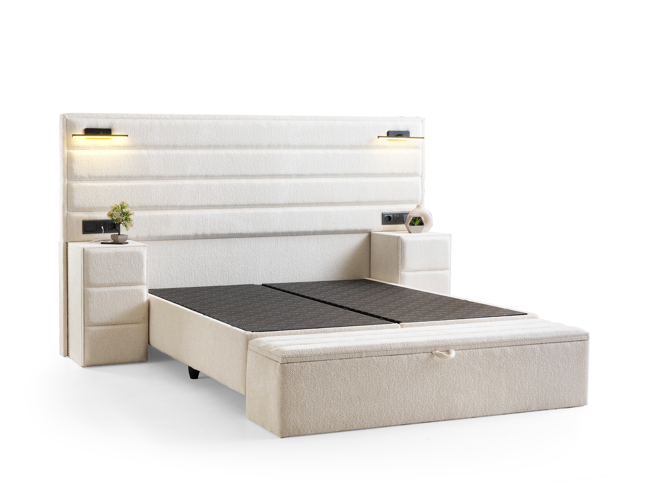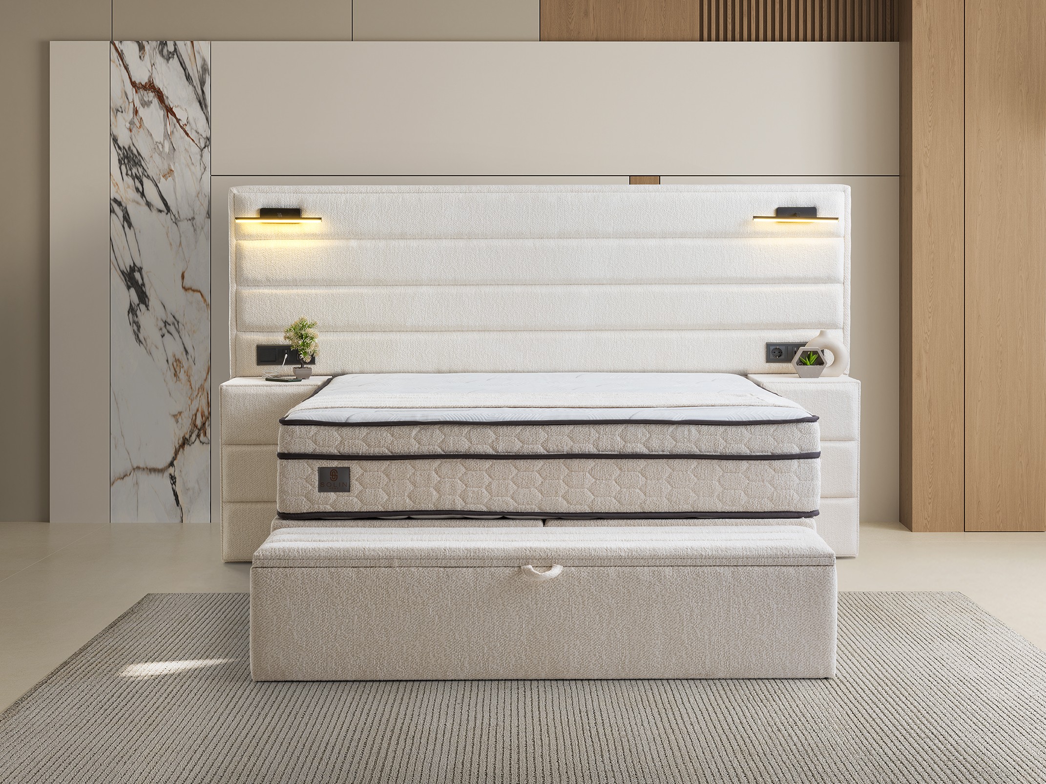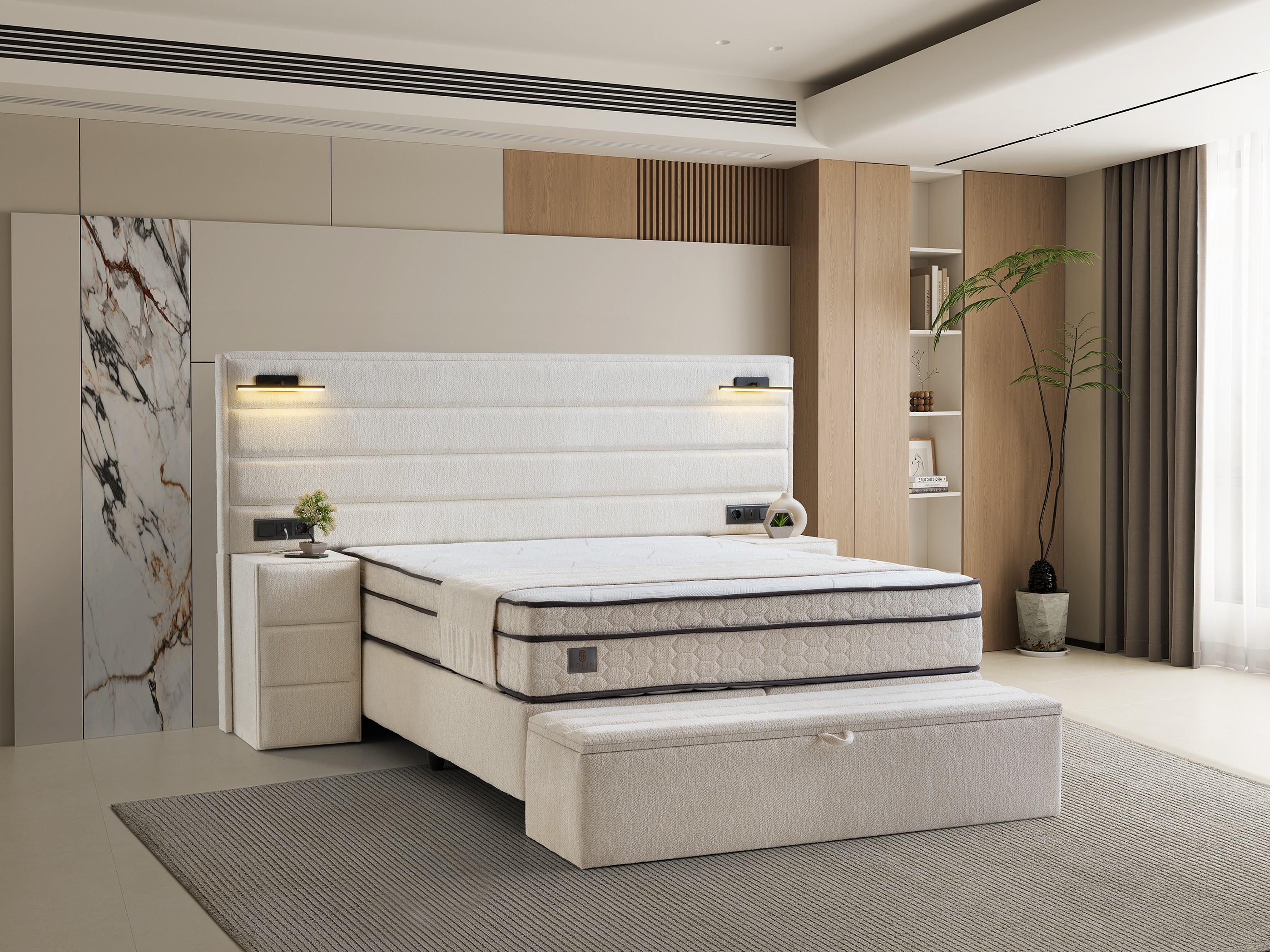 Design Cohesion: Matching nightstands that integrate with the headboard and a spacious storage bench (pouf) at the foot of the bed offer a seamless look and extra storage.