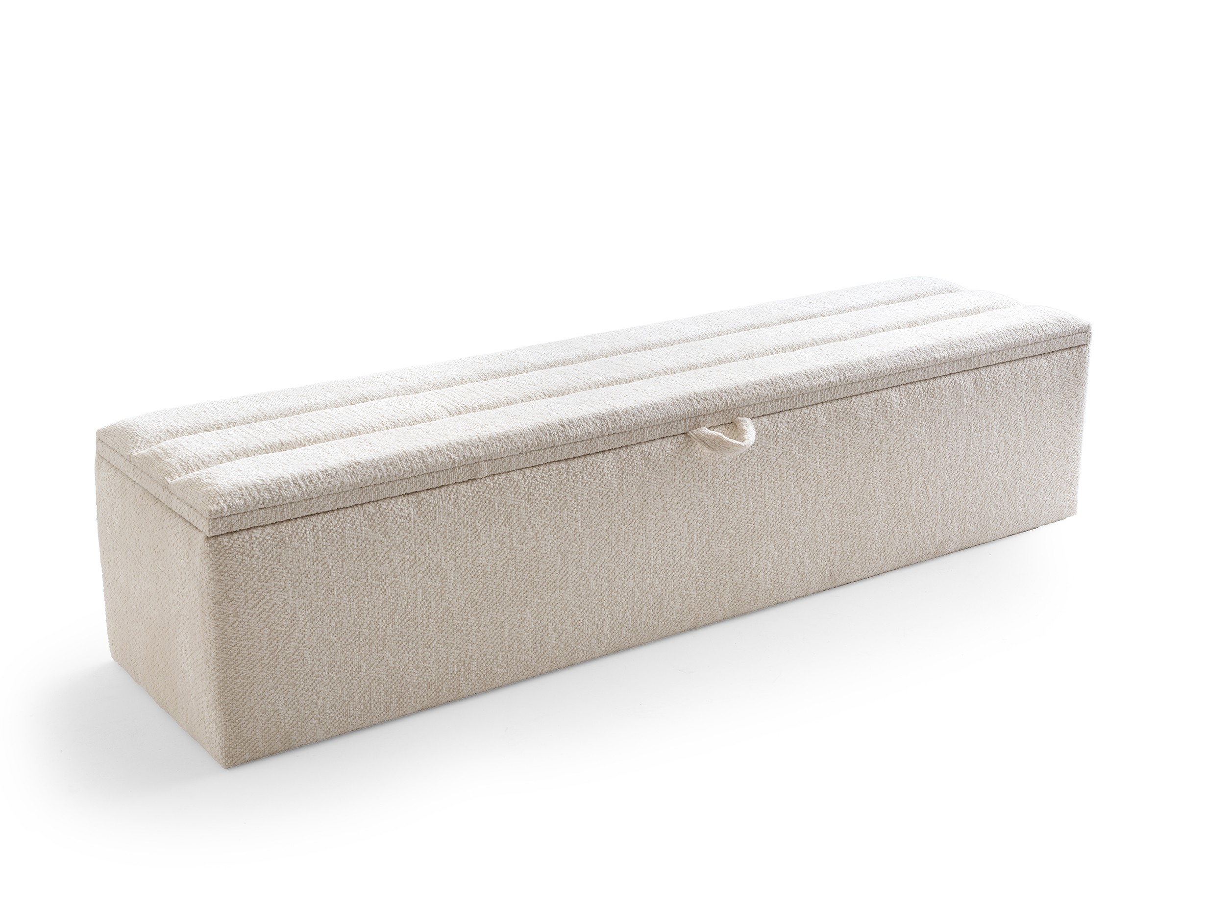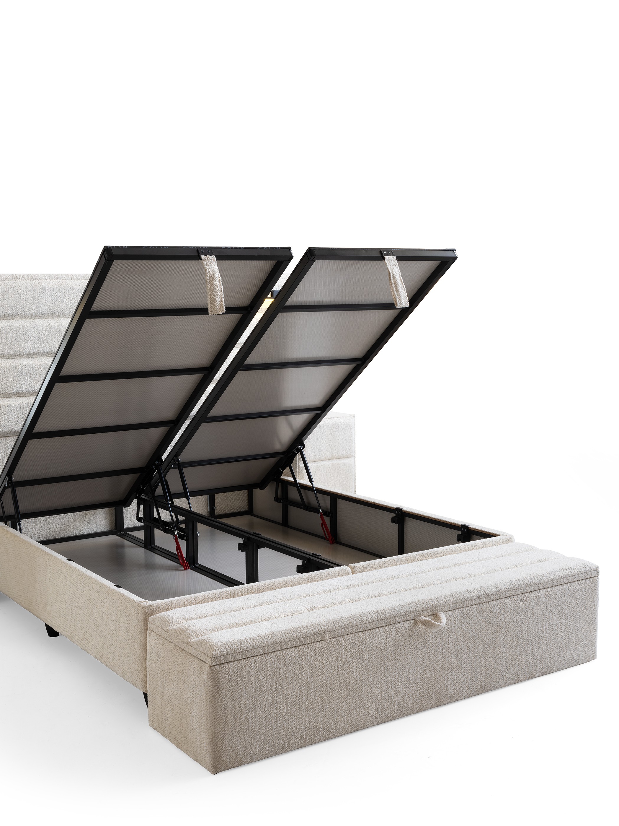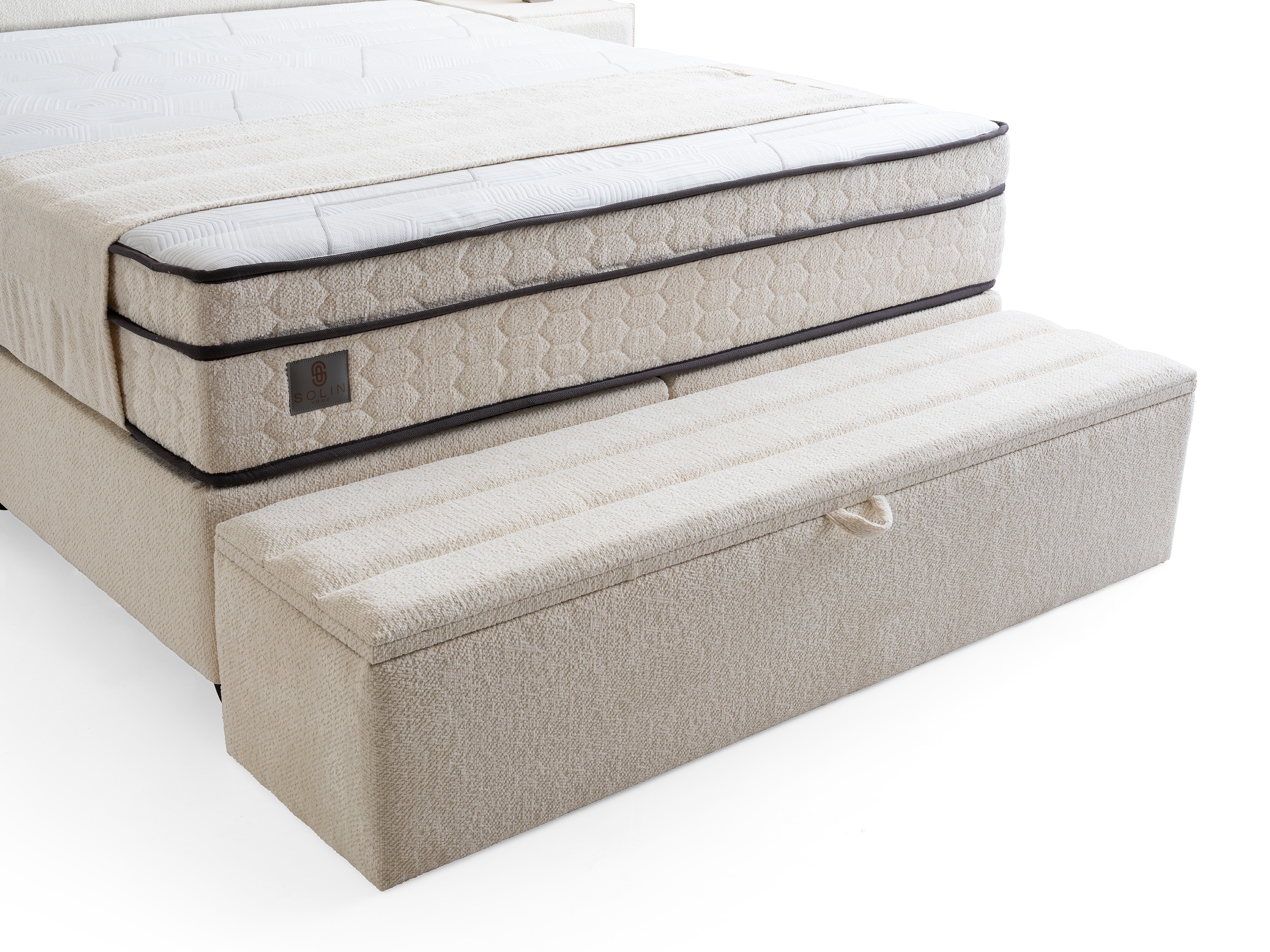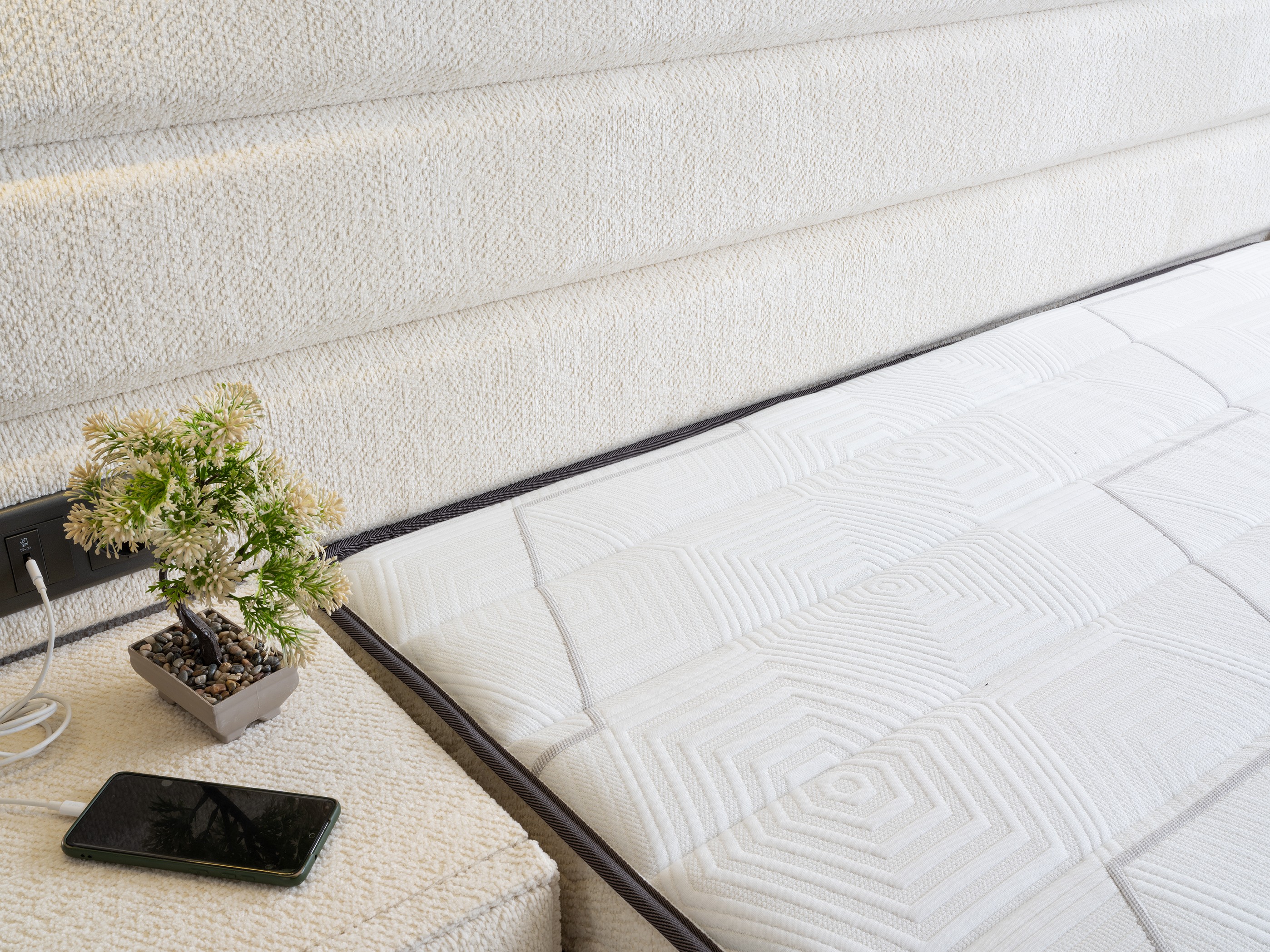 Design Cohesion: Matching nightstands that integrate with the headboard and a spacious storage bench (pouf) at the foot of the bed offer a seamless look and extra storage.