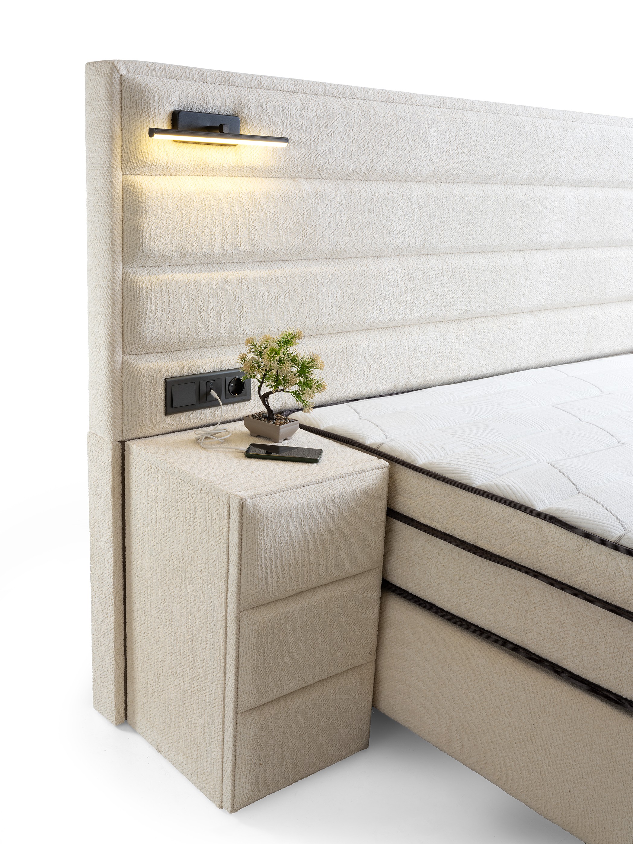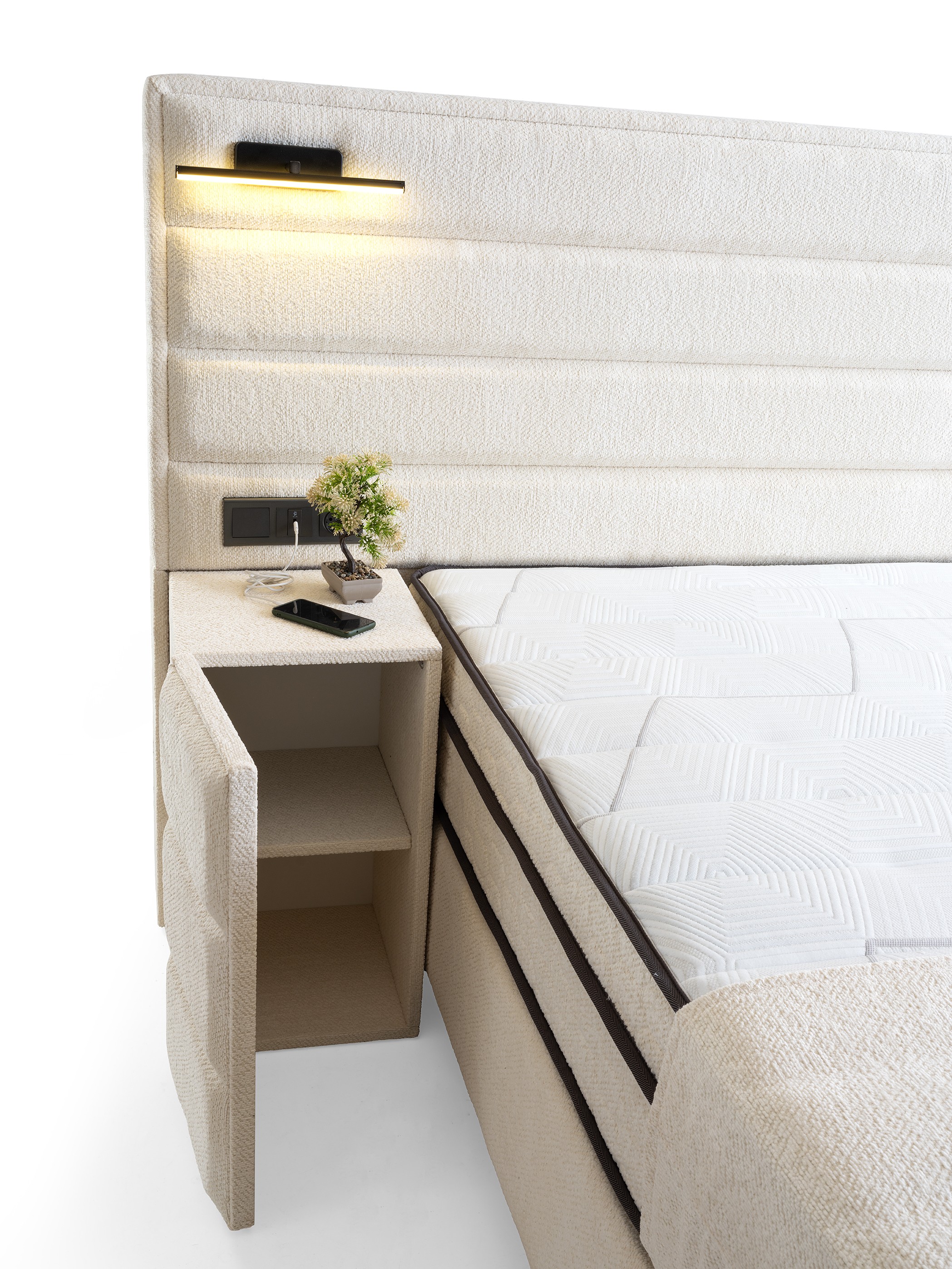 Designed to transform your bedroom into a modern sanctuary. The Verona Bed Base & Headboard Set redefines minimalist luxury with its clean lines, airy texture, and smart details. Inspired by hotel suites, this complete set will instantly add a bright and sophisticated feel to your room.