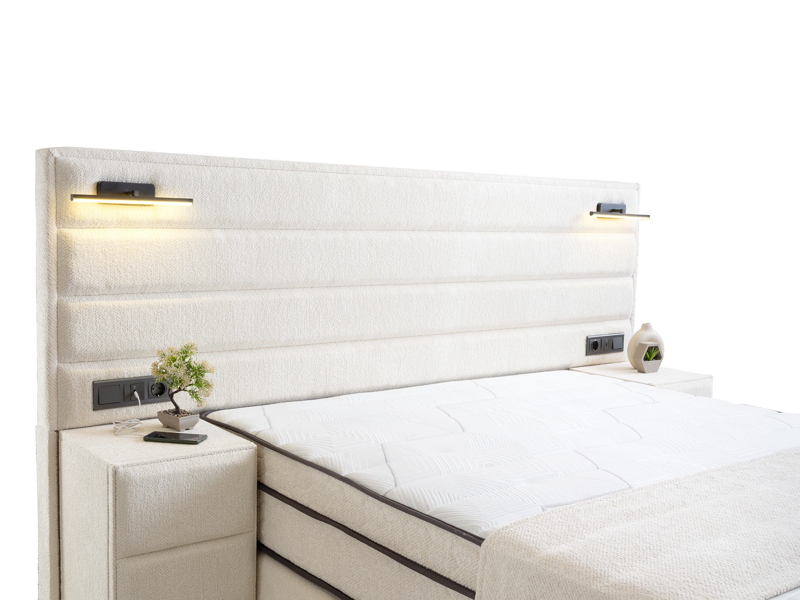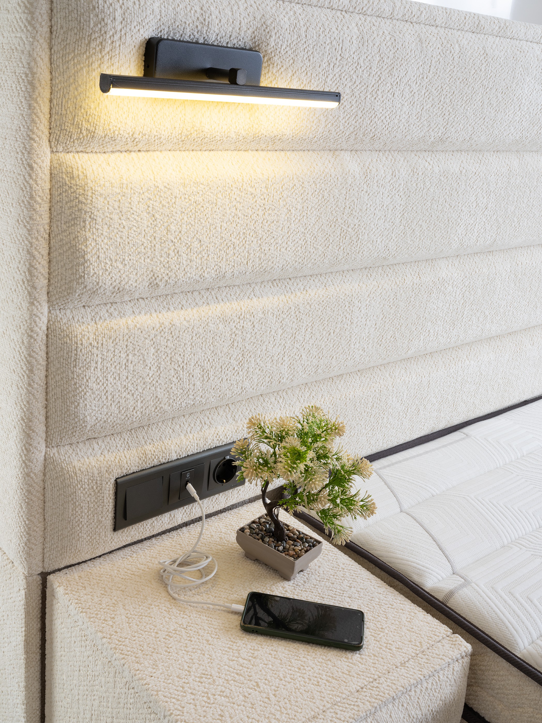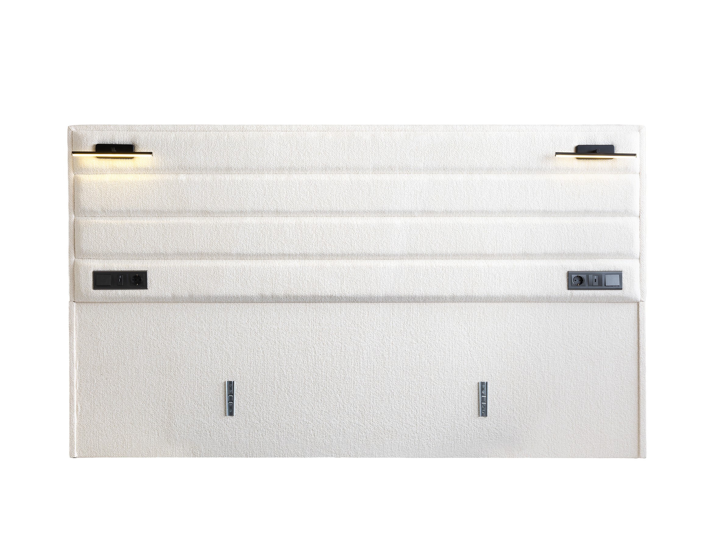 Headboard with Integrated Lighting: The wide, horizontally paneled headboard spans the width of the set and is equipped with modern, sconce-style lighting. This design creates a chic ambiance and is ideal for reading in bed.